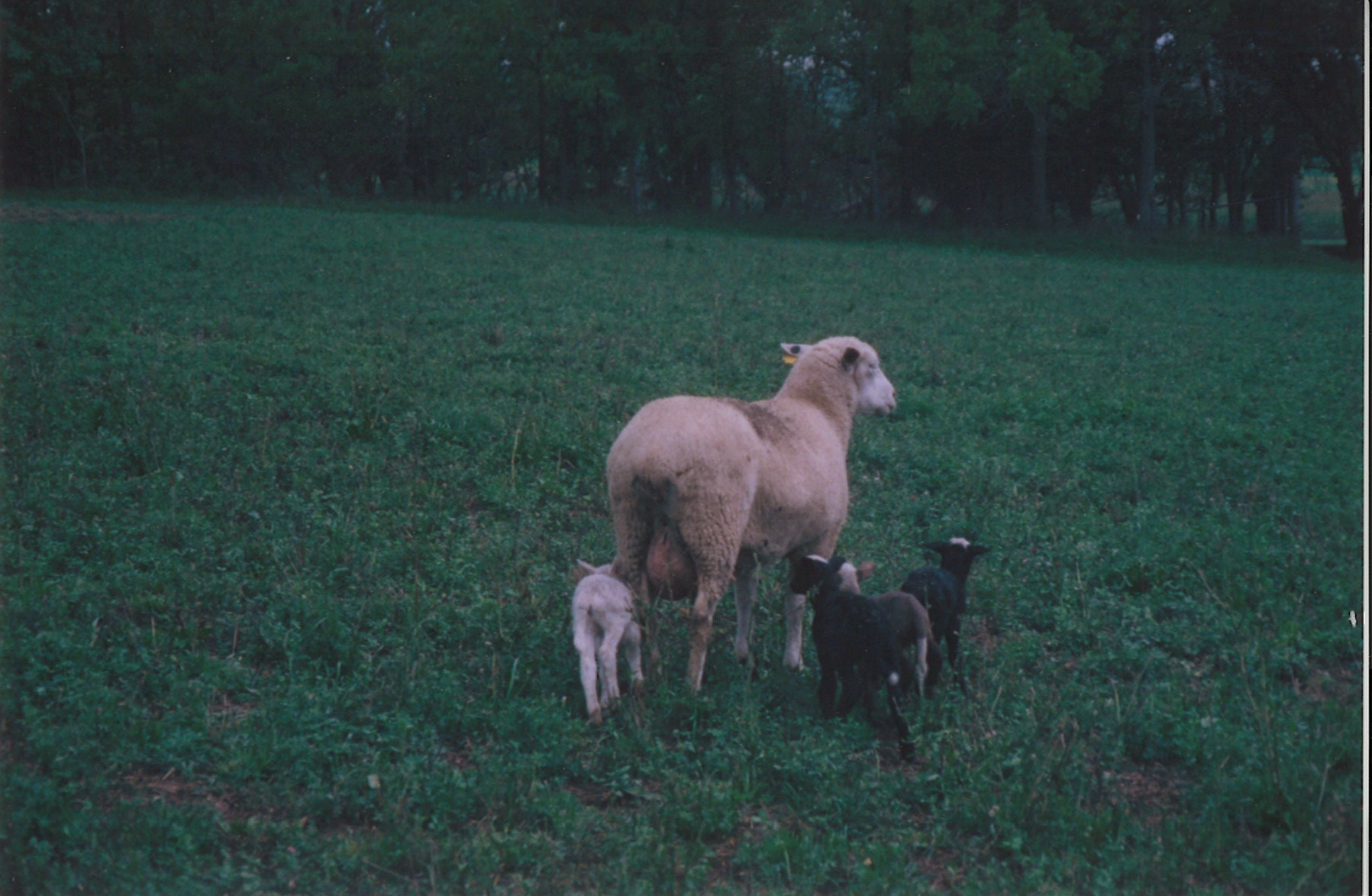 Ewe with Quadruplets Grazing on Pasture